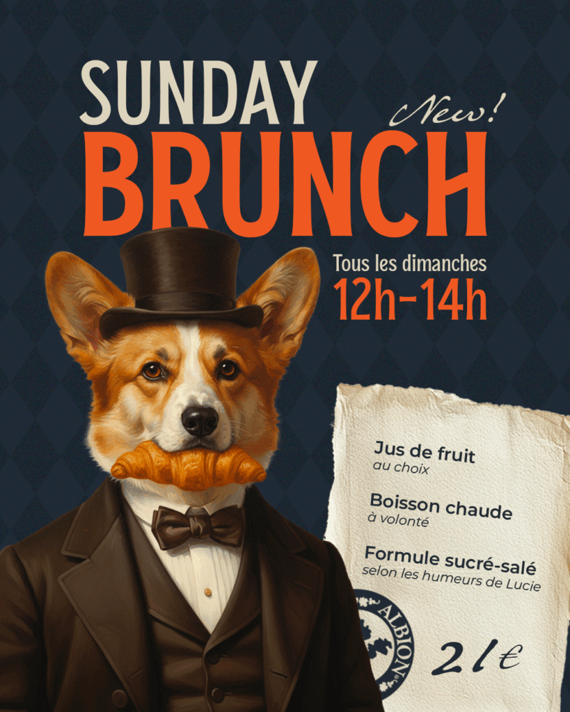 On avait les dimanches… il nous manquait le brunch. C’est chose faite : chaque dimanche, de 12h à 14h, on passe en mode sucré-salé avec jus de fruit, boisson chaude à volonté et les créations de Lucie. Un brunch façon Albion, à venir tester sans tarder.